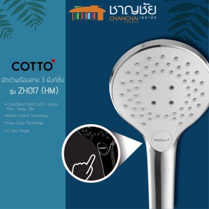 COTTO - ZH017 (HM) ฝักบัวพร้อมสาย 3 ฟังก์ชั่น ฝัวบัว รหัสสินค้า NBB1C200000217 คุณสมบัติ - เลือกปรับเปลี่ยนการใช้งานได้ 3 รูปแบบ Rain , Spray , Mix - Button-Switch Technology ปรับเปลี่ยนรูปแบบสายน้ำง่ายด้วยปุ่มกด - Easy-Clean Technology ง่ายต่อการทำความสะอาดสิ่งสกปรกที่ทำให้ฝักบัวอุดตัน เพียงใช้นิ้วถูปุ่มยางที่หน้าฝักบัว - 2 Step Hanger - เลือกวางฝักบัวได้ 2 แบบ - ใช้ร่วมกับวาล์วเปิด-ปิดน้ำ