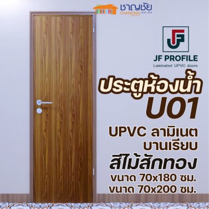 JF - U01 ประตู ลายไม้สัก UPVC ลามิเนต ประตูห้องน้ำ ประตูภายในขนาด 70x180 และ 70x200 ซม. (ไม่เจาะ) UDoor Series ประตู JF profile รุ่น UDOOR เป็นประตูรุ่นที่ทางบริษัท JF Profile ได้ทำการพัฒนาขึ้นมา เพื่อตอบสนองความต้องการของลูกค้าที่ชื่นชอบบาน ประตู UPVC แต่อยากได้ความหลากหลายมากกว่าประตูสีครีมและสีเทา ประตู JF profile รุ่น UDOOR เป็นบานประตูที่ขายดีเป็นอันดับต้นๆของทางบริษัท JF Profile ซึ่งได้รับความนิยมจากลูกค้าหลากหลายประเภทตั้งแต่ผู้ใช้งานจริง ผู้ออกแบบ บริษัทสร้างบ้าน คอนโด และโรงแรมต่างๆ นับว่าเป็นบานประตูที่ทำให้ทางบริษัท JF profile เป็นที่รู้จักอย่างกว้างขวาง บริษัท JF Profile เป็นผู้ผลิตบานประตูเจ้าแรกที่ทำประตูลามิเนตลายไม้และยังให้มีรูปแบบที่หลากหลาย ประตูรุ่น UDOOR นี้มีความแข็งแรงทนทานและเหมือนไม้จริงมาก เข้ากับงานตกแต่งได้หลากหลายเหมาะสำหรับคนรักงานไม้ แถมดูแลรักษาง่ายอีกด้วย ประตู รุ่น UDOOR ผ่านการผลิตจากกระบวนการ Extrusion โดยนำวัสดุในการผลิตมาหลอมด้วยความร้อน ผ่านแม่พิมพ์ ด้วยแรงดัน ได้ออกมาเป็นแผ่นของบานประตู โครงสร้างภายในที่ผ่านกระบวนผลิตออกมีมากถึง 28 ช่อง จากนั้นนำเข้าขบวนการปิดพื้นผิวด้วยการลามิเนต จนได้ออกมาเป็นบานประตูที่สวยงามแข็งแรงทนทานเหมือนกับประตูไม้ดูเป็นธรรมชาติแต่ได้ความคงทนและอายุการใช้งานที่ยาวนานกว่าประตูไม้ ใช้คู่กับวงกบได้ทั้งรุ่น A200, A220, B100, และ F328 ทาง JF Profile มีวงกบลามิเนตให้มีสีเดียวกับบานประตูด้วย เพื่อความสวยงามเข้าได้กับทุกการออกแบบตกแต่งตามที่คุณลูกค้าต้องการ ประตู รุ่น UDOOR มีให้เลือก 2 สี – สีลายไม้สัก – สีลายไม้วอลนัท ประตู รุ่น UDOOR เป็นรุ่นบานประตูที่ได้รับความนิยมอย่างมาในการมาติดตั้งแทนประตูไม้ โดยอย่างยิ่งนำมาติดตั้งเข้าคู่กับวง A200, A220 แทนที่ประตูและวงกบไม้แบบเดิมๆในบานประตูห้องน้ำ โดยเฉพาะ เนื่องจากบานประตูและชุดวงกบของทางเราเมื่อใช้ไปในระยะเวลานานหลายปี จะไม่มีการผุกร่อนเหมือนชุดวงกบกับบานประตูไม้ แล้วยังสามารถเลือกได้หลากหลายแบบตามความต้องการของคุณลูกค้า นอกจากนี้บานประตูและวงกบของเรา JF profile ได้ผ่านมาตรฐานในการผลิต มอก.1013/2533 จึงทำให้ท่านผู้บริโภคมั่นใจได้กับสินค้าของเรา แล้วสินค้าของเรายังมีคุณสมบัติในการป้องกันปลวก ป้องกันความชื้น ไม่ผุกร่อน ไม่ลามไฟ ป้องกันเชื้อรา และอายุในการใช้งานยาวนาน มากกว่า 20 ปี คุณสมบัติของ ประตู UPVC ลามิเนตลายไม้ ✅ ป้องกันปลวก 100% ✅ ไม่บวมหรือผุ ✅ ดูแลรักษาทำความสะอาดได้ง่าย ✅ ติดตั้งง่าย ✅ น้ำหนักเบา ✅ มีหลากหลายขนาดให้เลือก ✅