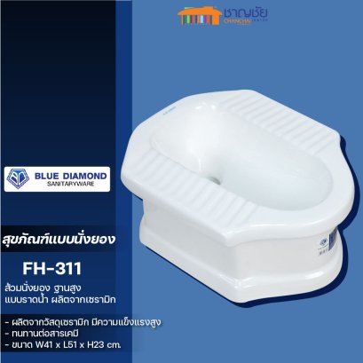 BLUE DIAMOND สุขภัณฑ์ตักราด ฐานสูง รุ่น FH-311 สีขาว รายละเอียดสินค้า ส้วมนั่งยอง ฐานสูง แบบราดน้ำ Blue Diamond รุ่น FH311 สุขภัณฑ์แบบนั่งยอง - ผลิตจากวัสดุเซรามิก มีความแข็งแรงสูง - ทนทานต่อสารเคมี - ช่วยให้คุณขับถ่ายได้สะดวก เพราะจากธรรมชาติเวลานั่งถ่ายนั้น ลำตัวของเราจะโน้มไปข้างหน้า ทำให้ลำไส้ตั้งอยู่ในแนวตรงจึงทำให้ขับถ่ายออกมาได้มากขึ้น - ช่วยทำให้ห้องน้ำไม่ดูอึดอัด พื้นที่ดูโล่งกว้างขวาง และสะอาดอยู่เสมอ - ขนาด W41 x L51 x H23 cm.